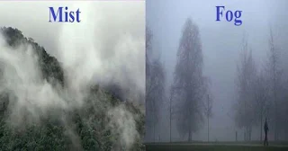 3) Fog and Mist: - When the temperature of an air mass containing a large quantity of water vapour falls all of a sudden, condensation takes place within itself on fine dust particles. So, the fog is a cloud with its base at or very near to the ground. Thin fog is called mist.